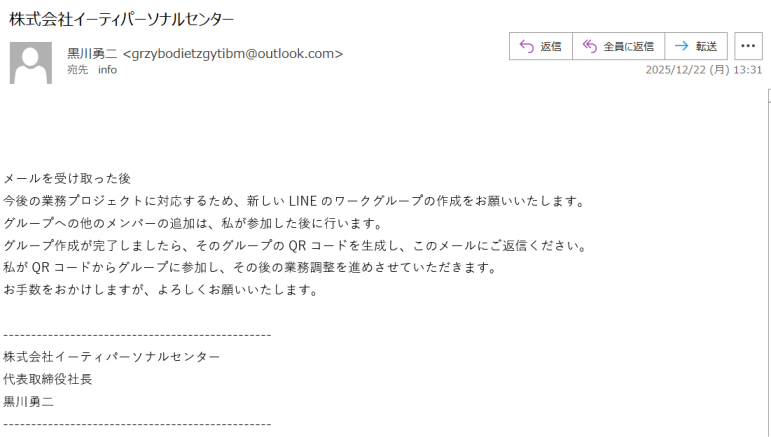 これらのメールは当社とは一切関係ございません。また当社から個別メールでLINEグループの作成をお願いすることはありません。