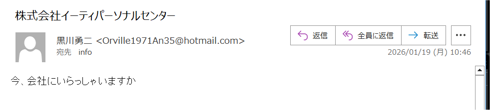 件名に当社名、送信元として当社代表者の名前が表示されておりますが、実際の送信元ドメインが当社のもの(@et-personal.com)とは異なります。(実際のなりすましメールの例はこちら例1)、例2)